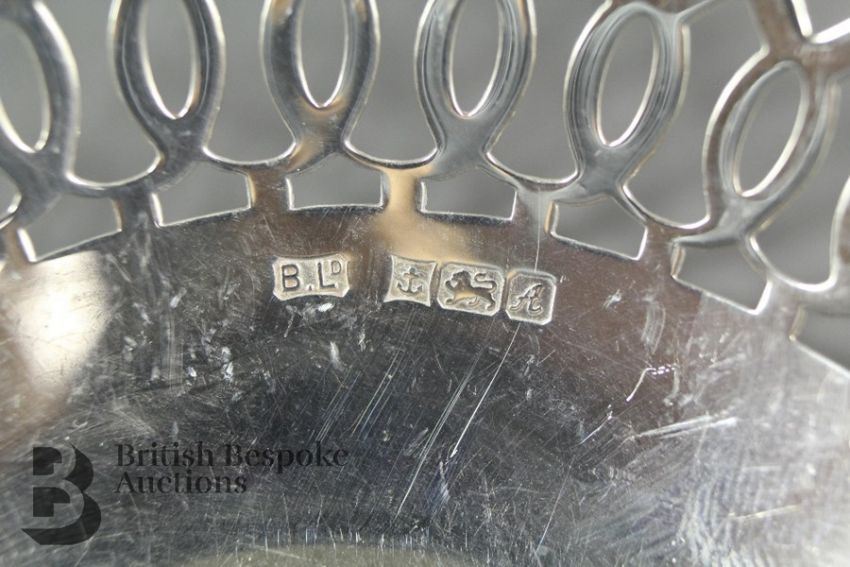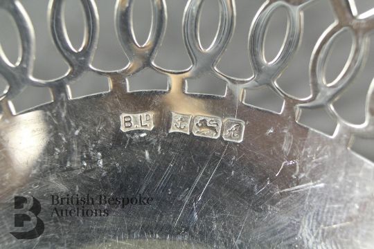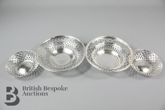 Four silver bonbon dishes with pierced sides of two sizes. The larger two are 15cms in diameter with rubbed hallmarks, and the smaller dishes are 9cms in diameter, Birmingham hallmark dated 1947, approx 250 gms total.