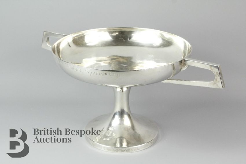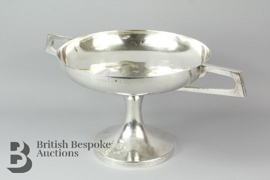 Military Silver - The York and Lancaster Regiment George V silver taza 'Platoon Tabloid Sports Cup', Sheffield hallmark, dated 1910/11, mm Walker & Hall, engraved 'To The Officers 5th Bn. The York and Lancaster Regiment from Captain A.B.Burdett Adjutant (1906-1911). The cup of shallow form with Art Deco handles approx 25.5 cms diameter and 20 cms h, approx 886.7 gms.