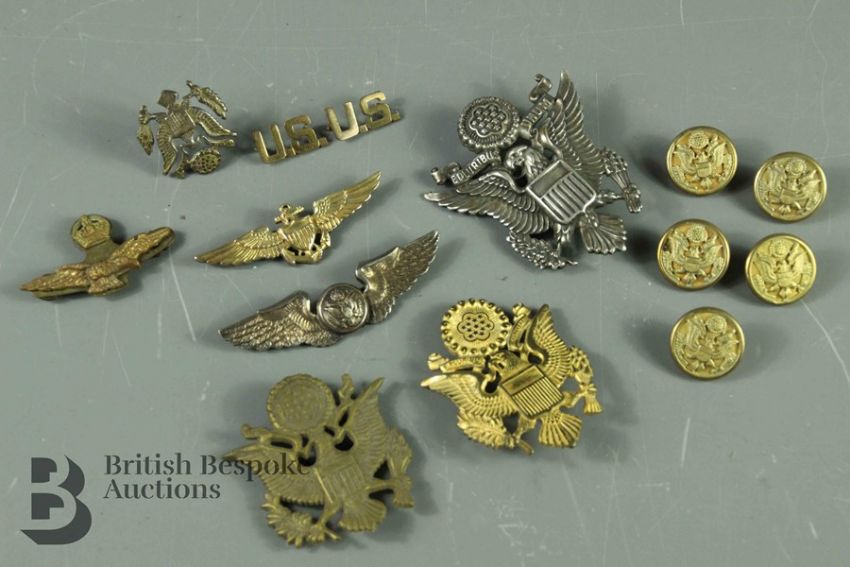 A Collection of WWII and post United States Air Force insignia, hat badges, buttons and pilots wings stirling in stirling silver.