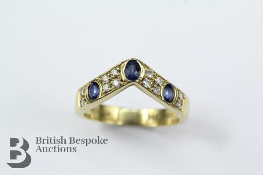 18ct yellow gold sapphire and diamond wishbone bracelet with matching ring. The bracelet set with five 3 x 2mm sapphires and 40 pts of dias, the ring stamped 18k set with three 3 x 2mm sapphires and approx 12 pts of dias, gross weight 25.3 gms.