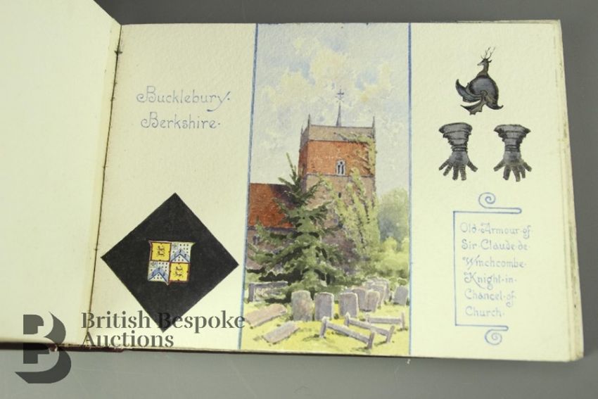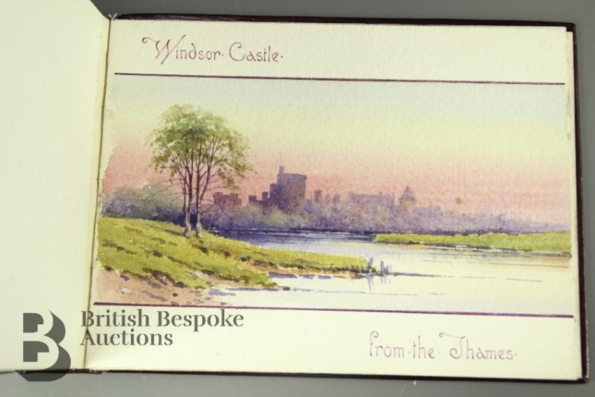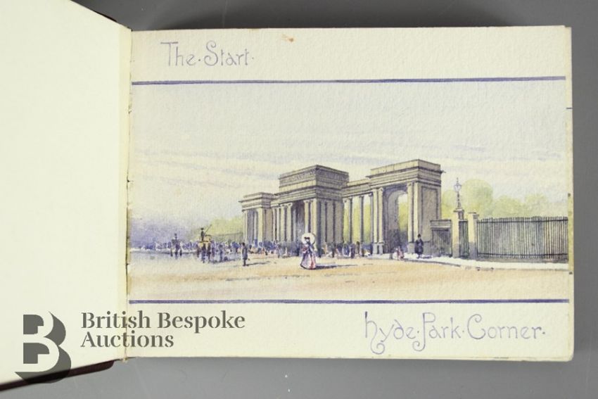 Over The Hog's Back West - Coaching Trip 1905. A wonderful illustrated account of a trip taken in 1905 by Henry Alexander Mitchell and his sister Isobel. The adventure undertaken by these two free spirited people is documented with charming series of illustrations bound in two volumes. They set off on August 24th from the Curzon Club near Hyde Park through London down to Richmond Park, the plan was to enjoy the countryside of Surrey until they crossed high up over the Hogs Back ridge into Hampshire and then down to Winchester, they were to return by a different route spending time exploring the Thames valley, taking in Henley and Goring. Each day they would cover a good distance and whilst resting the horses Harry would take out his easel and paint the places and scenes they had seen along the way. Many of these places are still recognizable today. The round trip measured approx 176 miles and took a week to accomplish. After many years of being admired by family members the books began to fall apart they have since had them repaired by the book conservator at Canterbury Cathedral Archives and divided into two volumes of burgundy calves leather binding with gilt tooled lettering both contained in a lockable book box. This is a charming collection of drawings by a talented and observant Edwardian artist. The sketches are in wonderful condition with bright, clean colours This lot comes with a black and white photograph of the two of them in the open carriage drawn by four horses complete with coachman who they nicknamed 'Chattering Arry'. Volume I contains 47 illustrations and Volume II 49 illustrations.