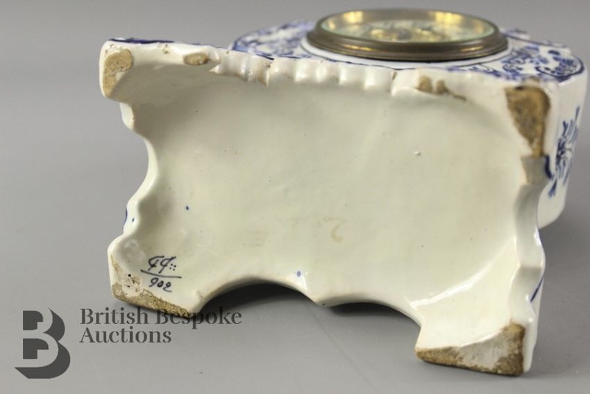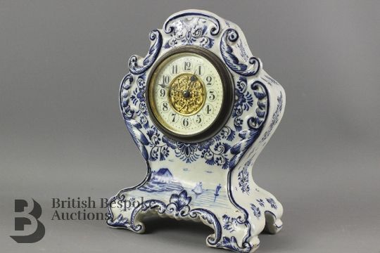 Delft mantel clock, gilded decoration with porcelain face and numeric dial, French movement V.A.P Brevete, approx 19 cms h.