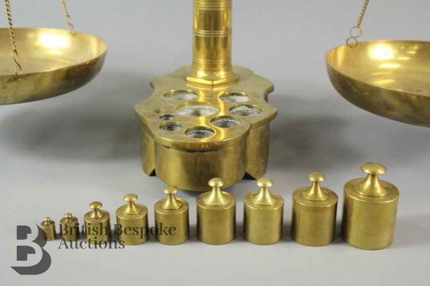 Libra Company 'Librasco' polished brass balance scales, the suspension point supported by a sea serpent motif with the design continuing on the balance arms, complete with integrated brass weights, approx 45 w x 60 h cms.