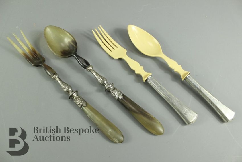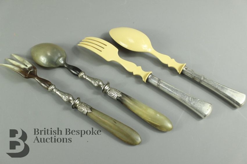 Salad servers, including polished horn servers and silver handled ivory bakelite servers.