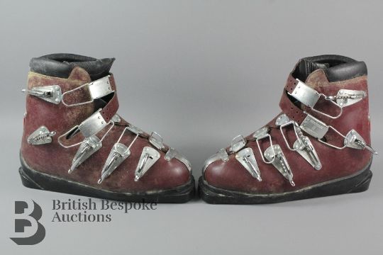 A pair of vintage Humanic red leather ski boots made in Austria, in mens size 10. Clear signs of wear but still in good condition.