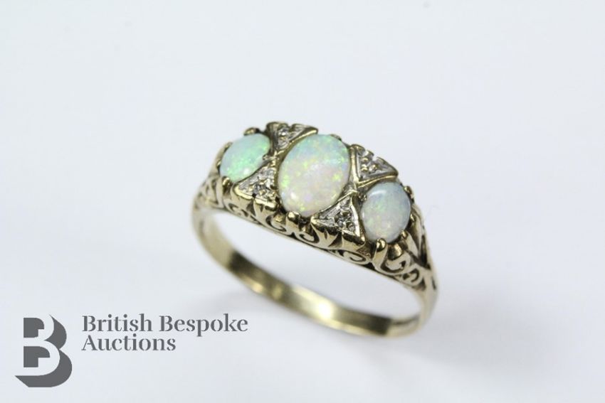 9ct yellow gold and opal ring, London hallmark, mm J & J, size Q, approx 4.9 gms (slight wear to opals not noticeable to naked eye, central opal nice and bright, shank slightly out of shape)