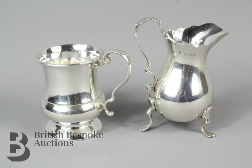 A small silver christening mug with scroll handle, Chester 1923 mm A.W 7cms h, 78 gms together with a silver creamer on three hoof, Birmingham hallmark, dated 1919 mm CSC & Co, approx 9 cms h. (2)