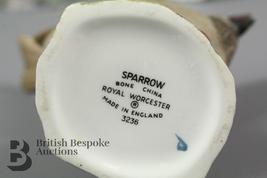 Seven Royal Worcester bone china woodland and garden birds; including Robin no 3197, Bullfinch no 3238, Sparrow no 3236, Hedge Sparrow no 3333, Nuthatch no 3334, Great Tit no 3335, Nightingale no 3337.