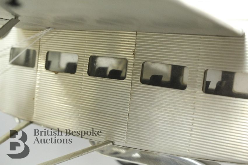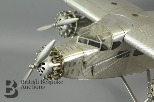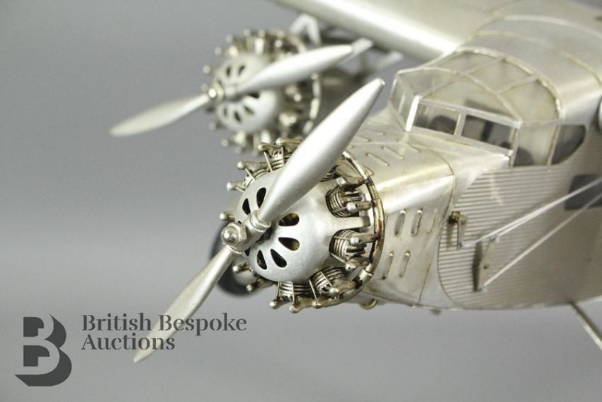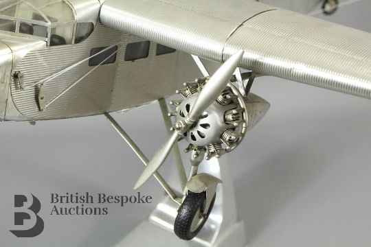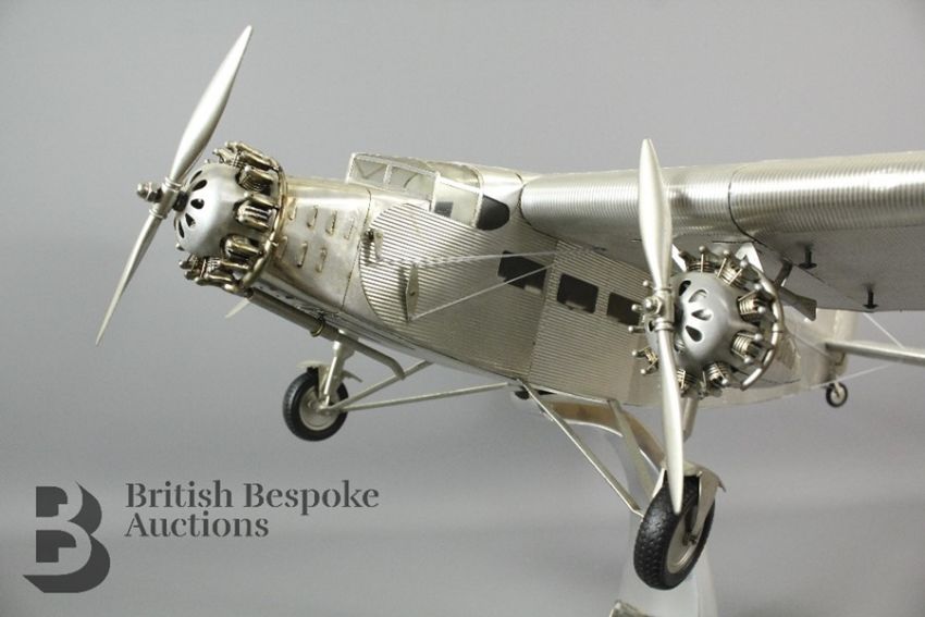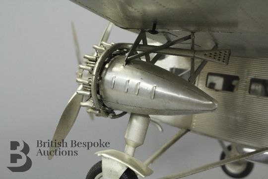 A Ford Trimotor AP452 model by Authentic Models on a metal stand. The aircraft is made from aluminium metal sheet on a lightweight wooden frame with three propellers and two rubber tires, measuring a 103 cm wingspan, 70 cm length and 40 cm height.