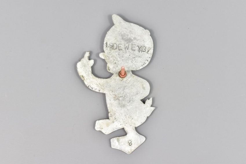 Walt Disney Dewey 1937 radiator grill-mounted mascot, featuring 'Dewey' (one of Donald Ducks nephew), the triplet cousins created for Disney by writer Ted Osborne and cartoonist Al Taliaferro. This was one of about 20 created to promote the Disney characters in 1937.