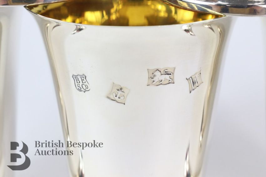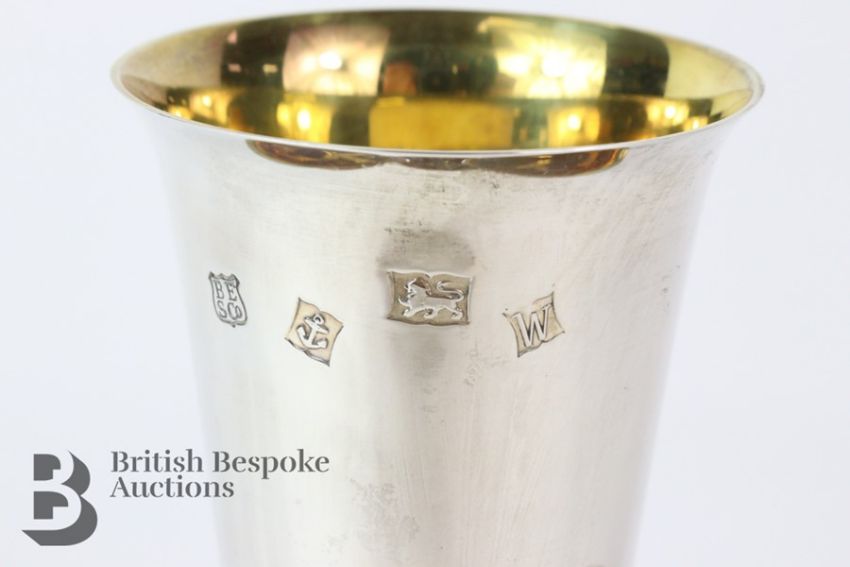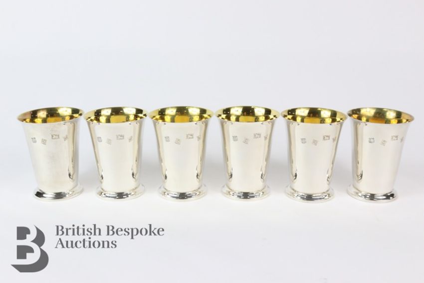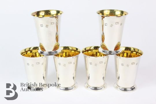Six silver tumblers, with gilded interiors, Birmingham hallmark, dated 1971 , mm Barker Ellis Silver Company, approx 8 cms, approx 563 gms.Note: in very good condition, gilding is clean and bright, clean hallmarks.