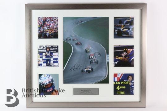 A signed and framed photograph of Alain Prost surrounded with smaller photographs with certificate of authenticity; caption reads 'Hand Signed by Alain Prost, Races: 202 (199starts), Championships: 4 (1985, 1989 and 1993), and Wins: 51, Podiums: 106, Career points: 768.5 (798.5), Pole positions: 33'. Signed photograph measures h43 x 29 cms, frame measures h67 x w78 cms.