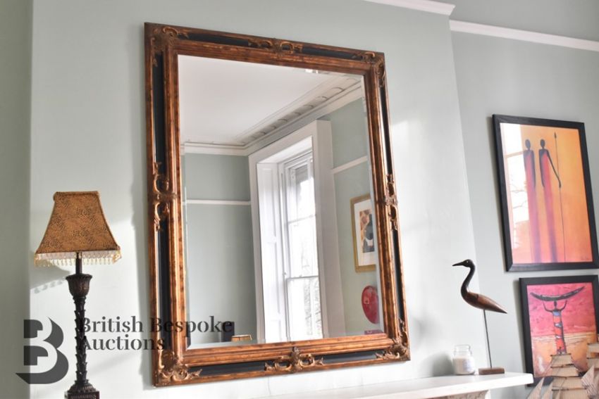 Contemporary black and gold bevelled glass mirror, approx 115 x 197 cms.