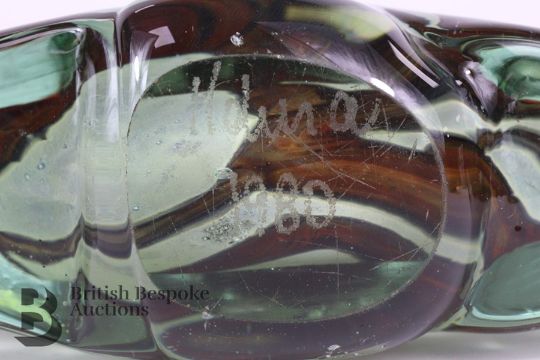 20th century Mdina glass bottle vase, purple and ochre design, approx 21 cms.