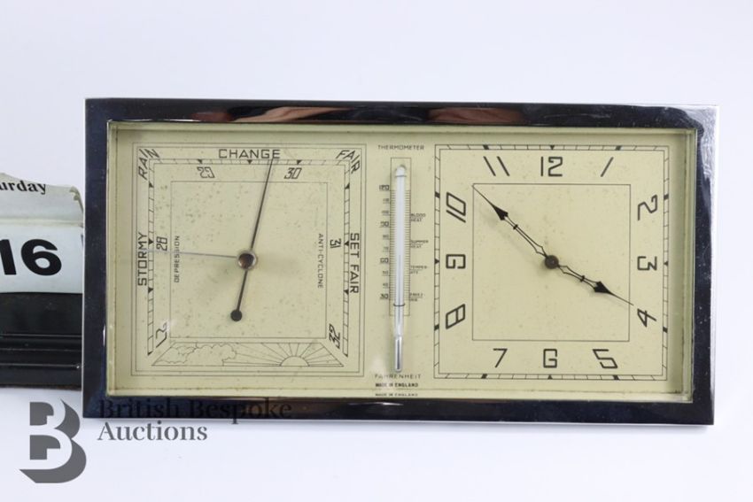 Art Deco Ronson 'Touch-tip' desk lighter approx 19 l x 9 w cms, early 20th century chrome desk clock, barometer and thermometer, approx 24 w x 13 h cms, an Abe chrome clock approx 18 x 9 x 14 cms together with a desk calendar and barometer (?). (4)Note: the clock has some enamel loss on the dial, the desk calendar and barometer is not functioning.