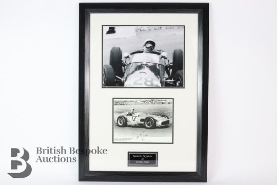 A signed and framed black and white photograph of Stirling Moss; caption reads 'Grand Prix of England, Aintree 1955, The winner Stirling Moss driving his Mercedes-Benz W196', frame measures h58 x w42 cms.