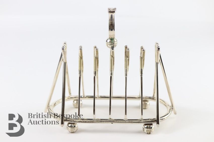 Silver plated toast rack in the form of cricket bats, approx 190 x 150 cms.