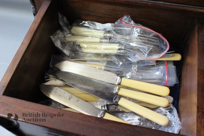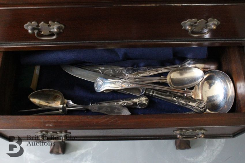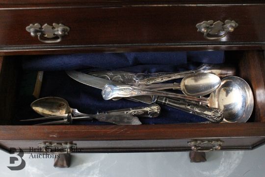 Mahogany canteen chest on chest, in the Chippendale style, the drawers opens to reveal silver plated flatware, approx 157 x 64 x 30 cms. The A1 Kings Pattern silver plated flatware includes twelve coffee spoons, 12 large knives, 12 small knives, 12 large forks, 12 small forks, 12 dessert spoons, 12 soups spoons, 6 unknown pattern coffee spoons plus sugar nips, carving knife, sharpener and fork, four serving spoons, large ladle and a cake slice (different pattern), together with 12 blue and white napkin rings modelled as garden snails and and six napkin rings, miscellaneous bone-handled butter knives etc.