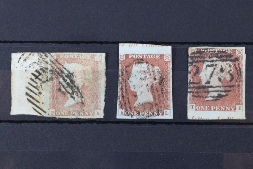 GB 1841 1d reds each showing parts of the marginal inscription.