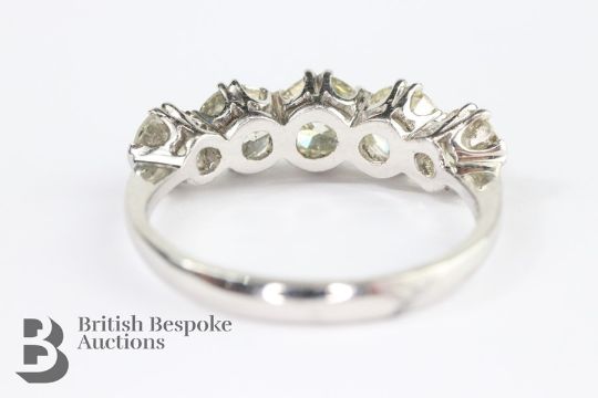An 18ct white gold five stone subtle yellow diamond ring, set with approx 3.34 cts of dias, colour K/M, size R, 4.44 gms.