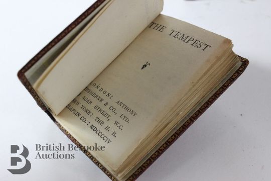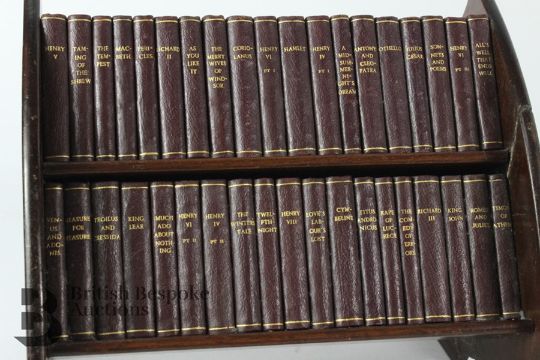 Circa 1904/5 miniature library of Shakespeare's works, maroon binding with gilded tooled titles to spine, 39 in total, housed in a mahogany shelving unit, approx 23 l x 20.3 h x 17.5 w cms.