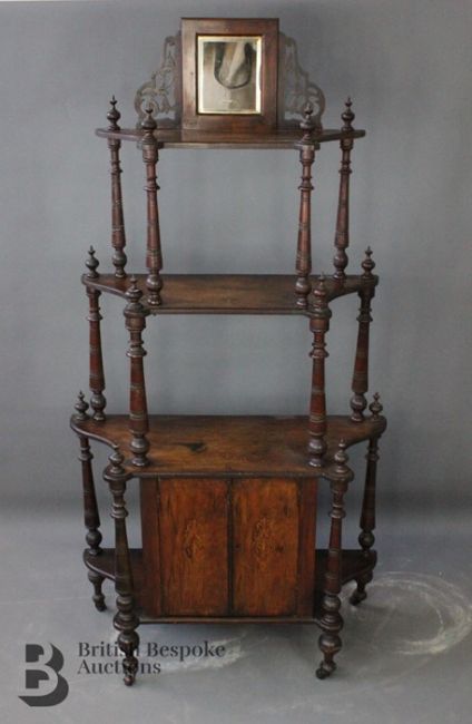 Early 20th century mahogany 'Whatnot', with decorative inlay, top gallery has a small bevelled mirror, three shelves with two cupboards which  beneath, approx 153 h x 79 x 30 d cms width.