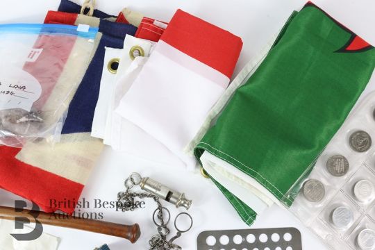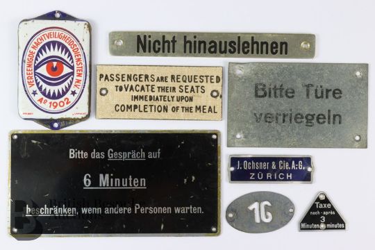 Miscellaneous vintage brass gun oiler, button stick, misc. vintage milk bottle, tops, train ticket, ARP whistle, candle snuffer, knitting needle sizes, button hook, rock and ash rain from the 1906 eruption of Mount Vesuvius Naples, Shell coins, quantity of small enamel signs including foreign examples.