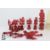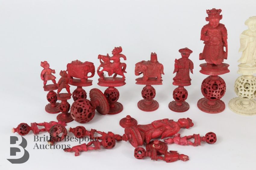A part Chinese carved bone puzzle ball chess pieces, both natural and dyed red. 18 figures, intricately carved with puzzle balls and bases, plus some extra parts. The king measures approx 13cms h, pawn measures approx 7cms h.