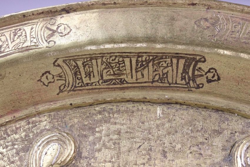 Ancient heavy cast bronze and mixed alloy hunting plate, possibly Persian in origin, the interior of the bowl cast with a figural scene having finely incised details in silver. The plate depicts a mounted nobleman possibly a Sassanian king hunting lions, wearing a domed crown with rippling streamers behind him. The king is depicted with a sword in his left hand and a coiled lasso in his right, inlaid silver reflected on the harness, saddle garments and horses mane. The bowl having a flared rim with incised decoration which may also be an ancient inscription as no two are the same, approx 29 cms d.