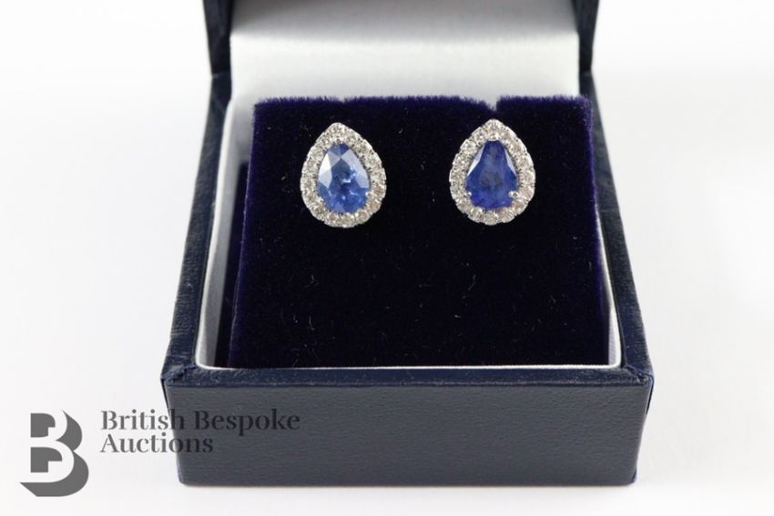 Pair of 18ct white gold pear shaped sapphire and diamond stud earrings approx 2.3cts. The pear-shaped sapphires measure approx 7 x 5 mm, total weight 2.5 gms.