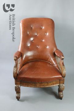 Button back faux-leather chair, Victorian frame but with recent upholstery on decorative carving to the lower arm support and knee of the cabriole legs.