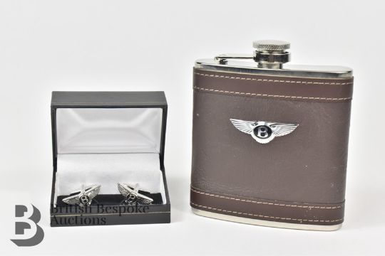 Bentley interest - a pair of unisex shirt cufflink's, in the original box as issued and a very attractive drinks flask for the Bentley owner. (2)