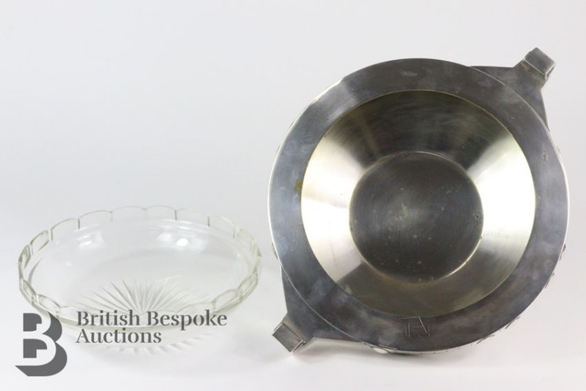 Unusual Art Deco silver plated twin handled fruit bowl, having a cut-glass liner, engraved Ramel Pa approx 34 diameter x 11 h cms, raised on four feet.
