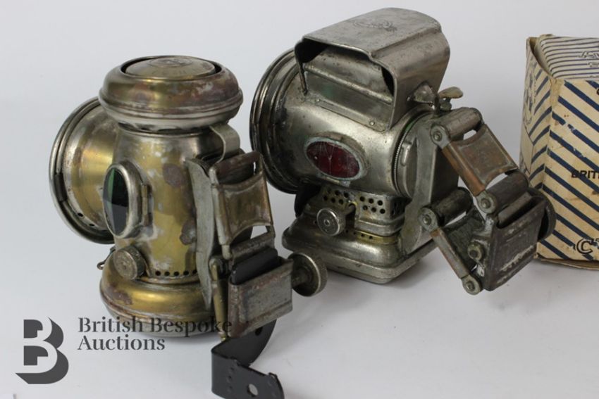Four early 20th century bicycle oil lamps including a brass Lucas Silver King bicycle oil lamp, Captain No 59, approx 12 cms, together with a nickle-plated Silver King bicycle oil lamp approx 12.5 cms h and a black enamel painted Japanese example approx 12 cms h and a black enamel 3 star bicycle lamp complete with original box. (4)