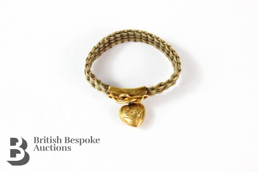 Georgian hair embroidered mourning ring, together with a 14ct gold knot band with heart charm, size Q, approx 1.15 gms.