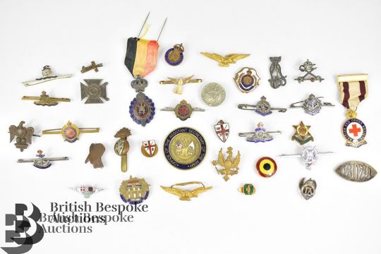 Thirty six cap badges and buttons including Royal Dragoons, Royal Army PT Corp, Assistant Secretary of the Army Challenge coin, two RAF Eagle cap badges, Royal Irish Fusiliers cap badge, Habilete Moralite Labor mint medal 2nd class, Essex Regiment, Egypt cap badge, Royal Engineers and Naval cap badges and Kings Hussars amongst others.
