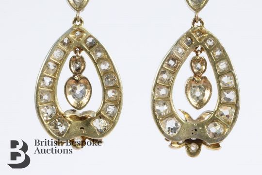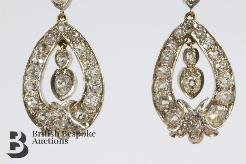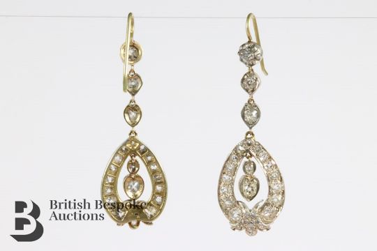 Pair of yellow and white gold diamond drop earrings. The ornate tear-drop earrings set with 3.7cts of old-cut diamonds, the drop measures approx 45 mm, approx 7.3 gms.