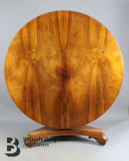 19th century rosewood circular dining table, tapered column on tripod base, terminating on scroll feet, circa 1840, approx 130 cms diameter.
