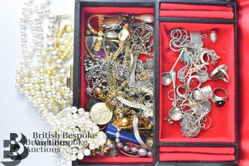 Miscellaneous costume jewellery, including a cameo brooch, balloon glass pendant on chain, rolled gold child's bangle, rolled gold locket, silver-metal locket on sterling silver chain, earrings, two Sekonda wrist watches together with simulated pearls and a quantity of silver including rings, chains, thimble, two silver salt spoons etc (silver weight 64 gms).
