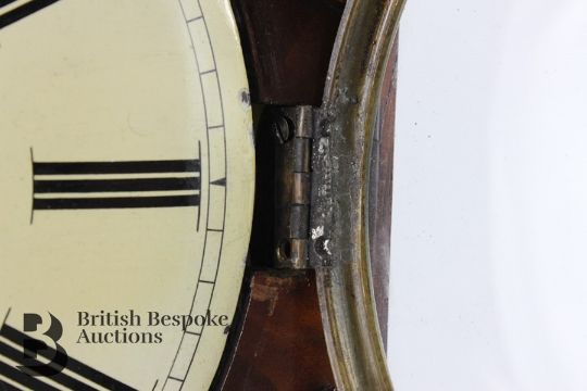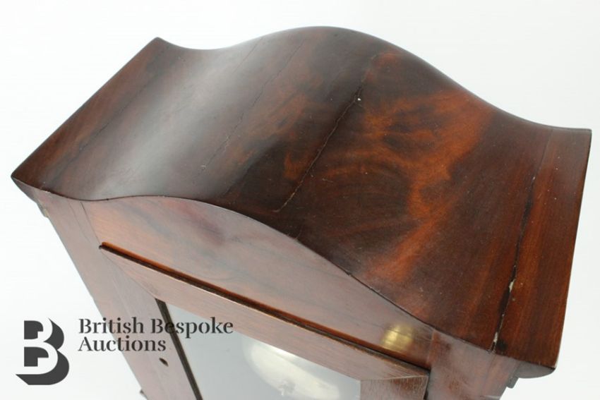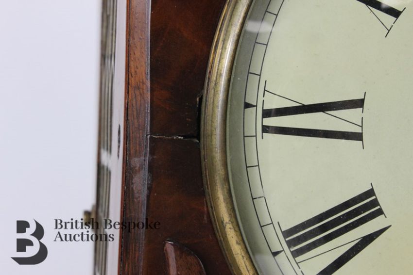 19th century English mahogany cased bracket clock. The clock having a cream enamel face with Roman dial, double fusee 8 day movement striking to a bell, decorative carving to case raised on floral feet, approx 30 w x 42 h x 16 d cms. Note: pendulum suspension spring has snapped. Case has five heat cracks to the domed top (see image), screw missing to door hinge, horizontal crack to the case near the door catch (see image).