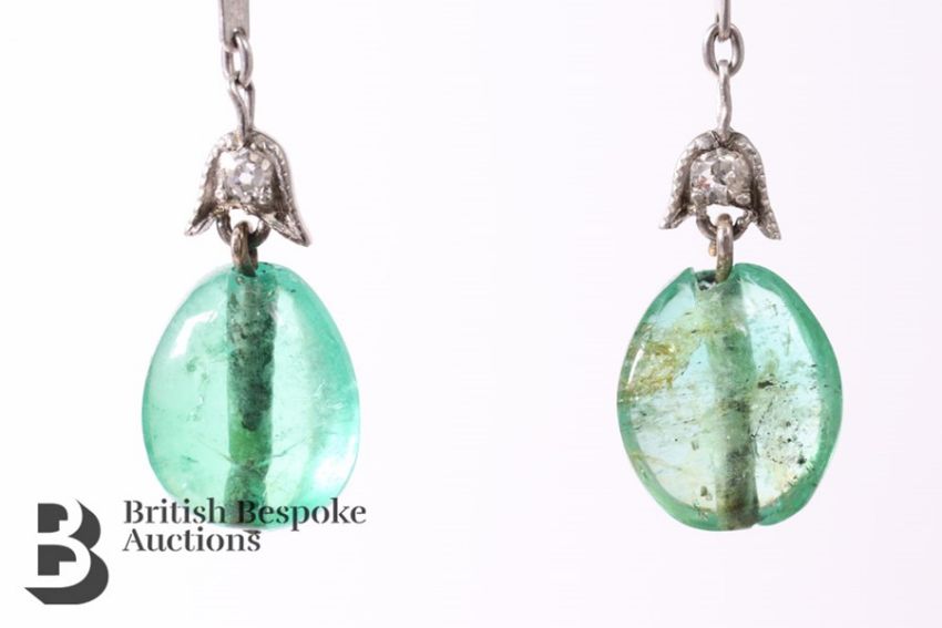 Pair of emerald and diamond drop earrings. Each earrings set with a 2ct emerald, total emerald weight 4cts and further set with 14 pts of old-cut dias, approx 38 mm in length.