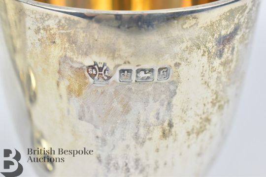 Three silver goblets, Sheffield hallmarks, dated 1907, 1908 and 1910, two will gilded interiors, mm William Hutton & Sons, approx 352 gms.