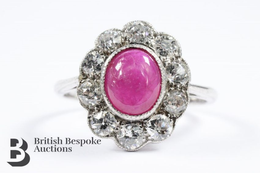 Cabochon ruby and diamond ring. The ring set with a ruby of 1.6 cts surrounded by 0.90 cts of dias, set in a platinum mount, size N, approx 3.1 gms, Birmingham hallmark, mm A & P, stamped 750.