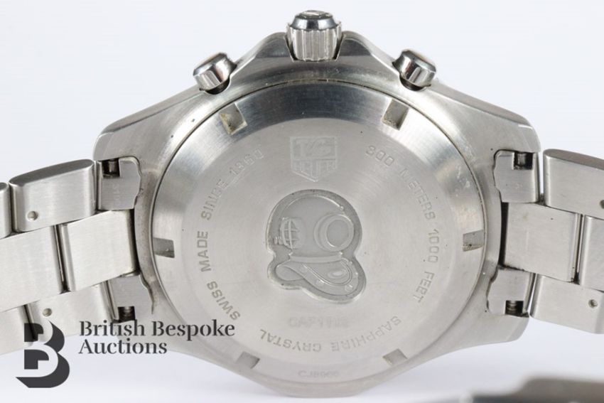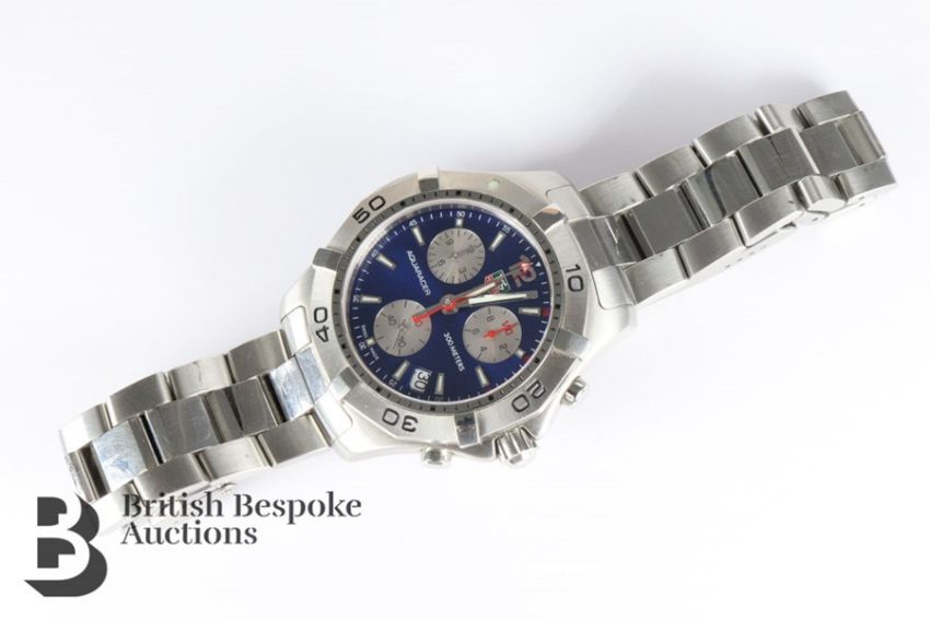 Gentleman's Tag Heuer Quartz Aquaracer wrist watch. The watch having a blue face with silver subsidiary dials and rotating bezel on stainless steel TAG bracelet, nr CAF1112.BA0803. The watch having original box, instruction manual, barcode tag, case nr CJ8966, complete with papers and original receipt dated 2008, with two spare links. Note: watch not moving forward at time of cataloguing, new battery required, good overall condition.