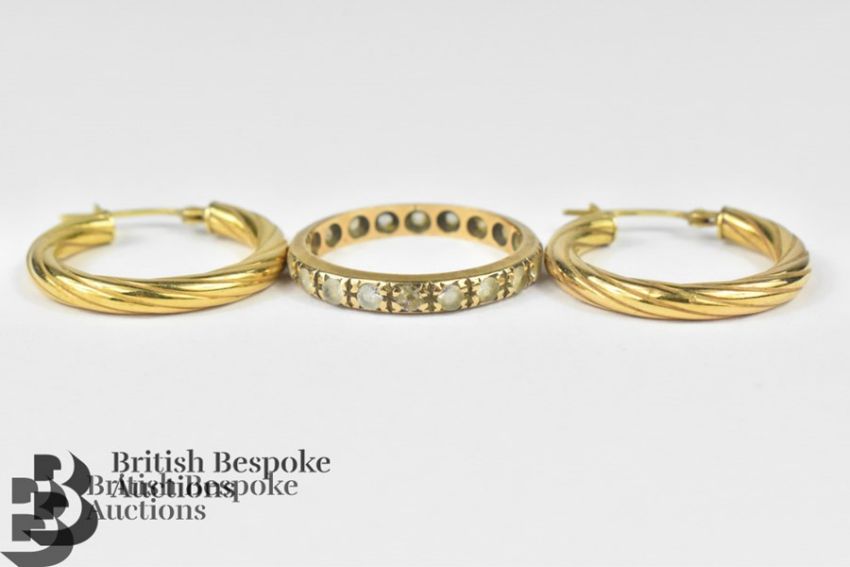 9ct gold jewellery, including a pair of heart-form earrings, yellow gold and rose gold cross pendants, neck chain (end link broken) 45 cms and a 9ct gold and white sapphire ring size O, together with a 9ct gold bar brooch, gross weight 15.8 gms and a gold-metal locket and bar brooch.