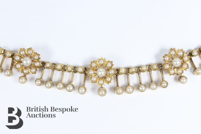 Edwardian 15ct yellow gold pearl necklace. The necklace set with five rosettes and having satellite pearl drops, approx 45 cms, approx 18.9 gms.