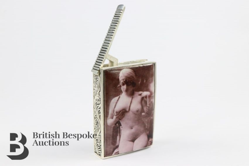 Silver vesta case, depicting a feminine nude, approx 32 x 48 mm, approx 40 gms.