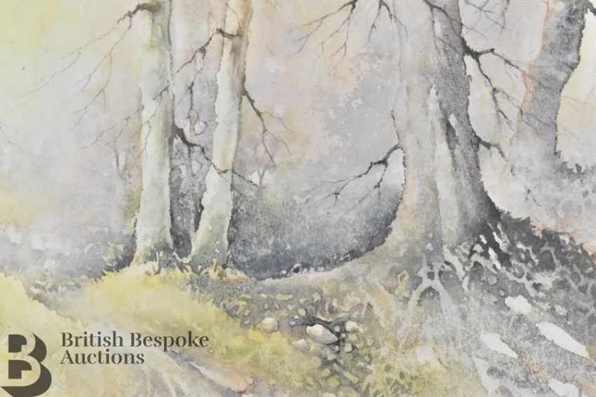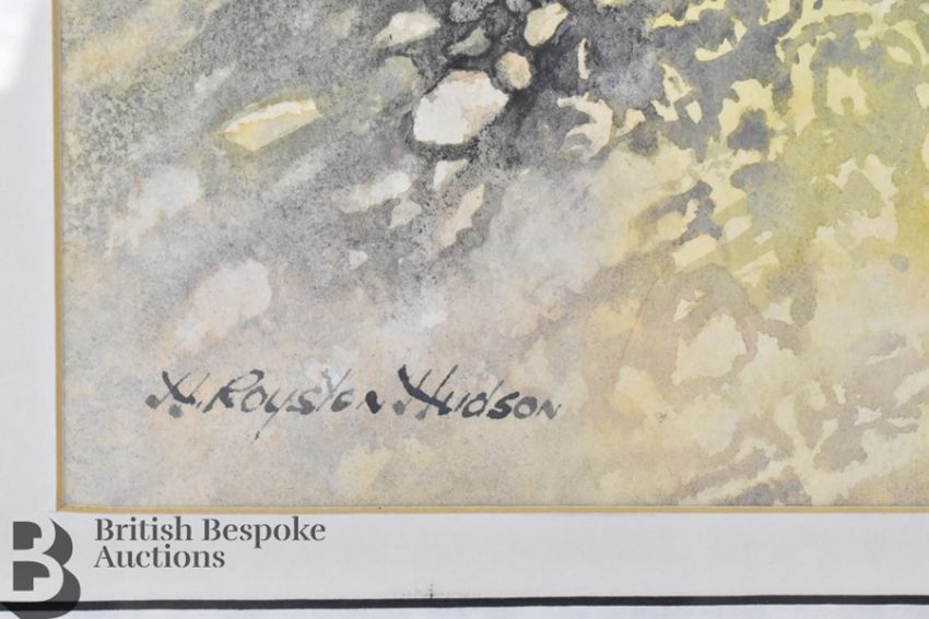 H. Royston Hutson 20th century watercolors, the first depicting a tranquil lake scene, approx 63 w x 36 h cms framed and glazed and another entitled Cranham Woods Gloucestershire approx 52 x 24 cms, both framed and glazed. (2)