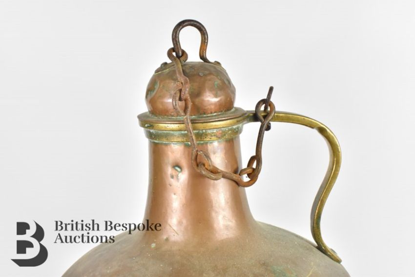 19th century copper Islamic water vessels. The first example is large with a domed cover, brass handle with chain, approx 60 cms in h, the second example is copper with domed cover and brass handle with chain approx 53 cms.(2)
