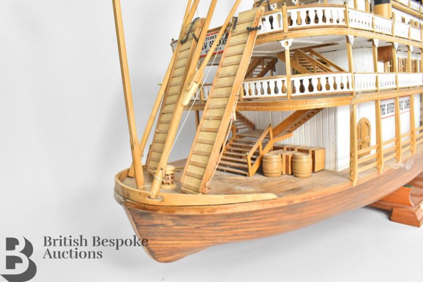 Scale model of a Mississippi steam ship or paddle boat Matthew V Spress by the The River Prince Company, approx 105 l x 23 w cms, uncased.